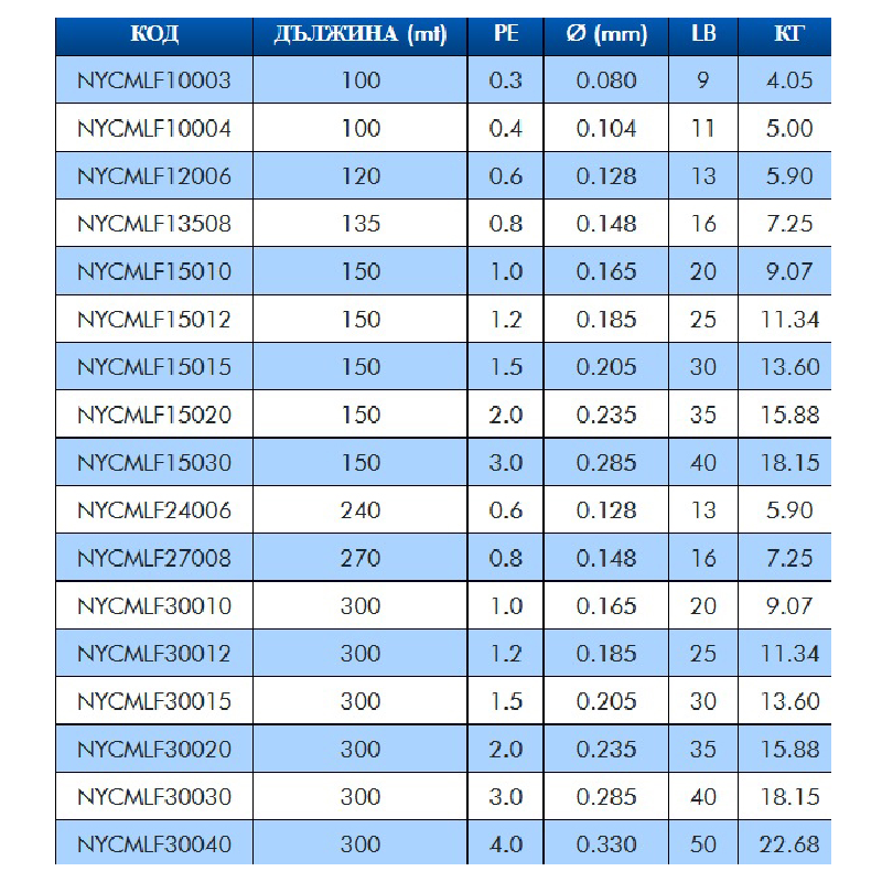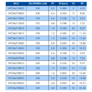 | Размер на влакното - мм./PE | 0,104/0.4, 0,128/0.6, 0,148/0.8, 0,165/1.0, 0,185/1.2, 0,205/1.5, 0,235/2.0, 0,285/3.0, 0,33/4.0 |