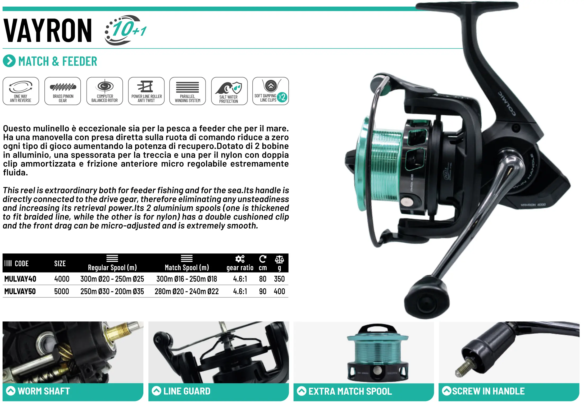 VAYRON е флагмана, най-високия клас макара на Colmic! Оборудвана е с 10+1 лагера. Безкомпромисно качество и внимание към всеки детайл. Предназначена е за средни и дълги дистанции на риболов. Дръжката е директно свързана със задвижващата предавка, като по този начин се елиминира всякаква нестабилност и се увеличава силата на извличане.